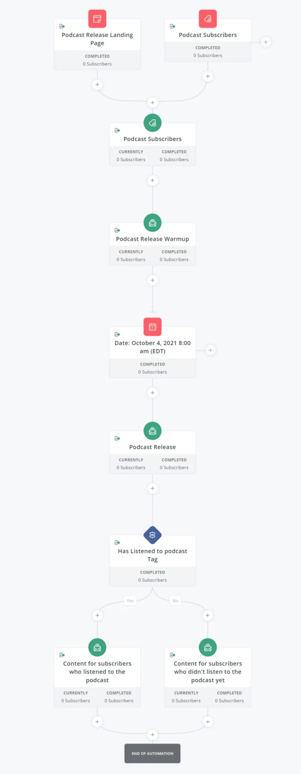 No product? No problem. When you use Kit, you get access to our full library of automation templates, like this template that focuses on podcast marketing only:
