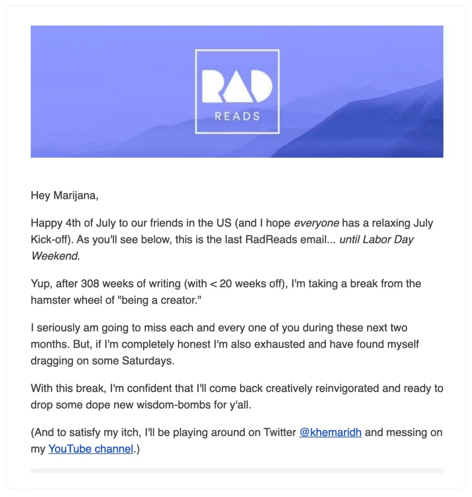 - Khe Hy, the creator and coach behind RadReads, took a two-month break from his weekly newsletter in summer 2021 when he began feeling exhausted