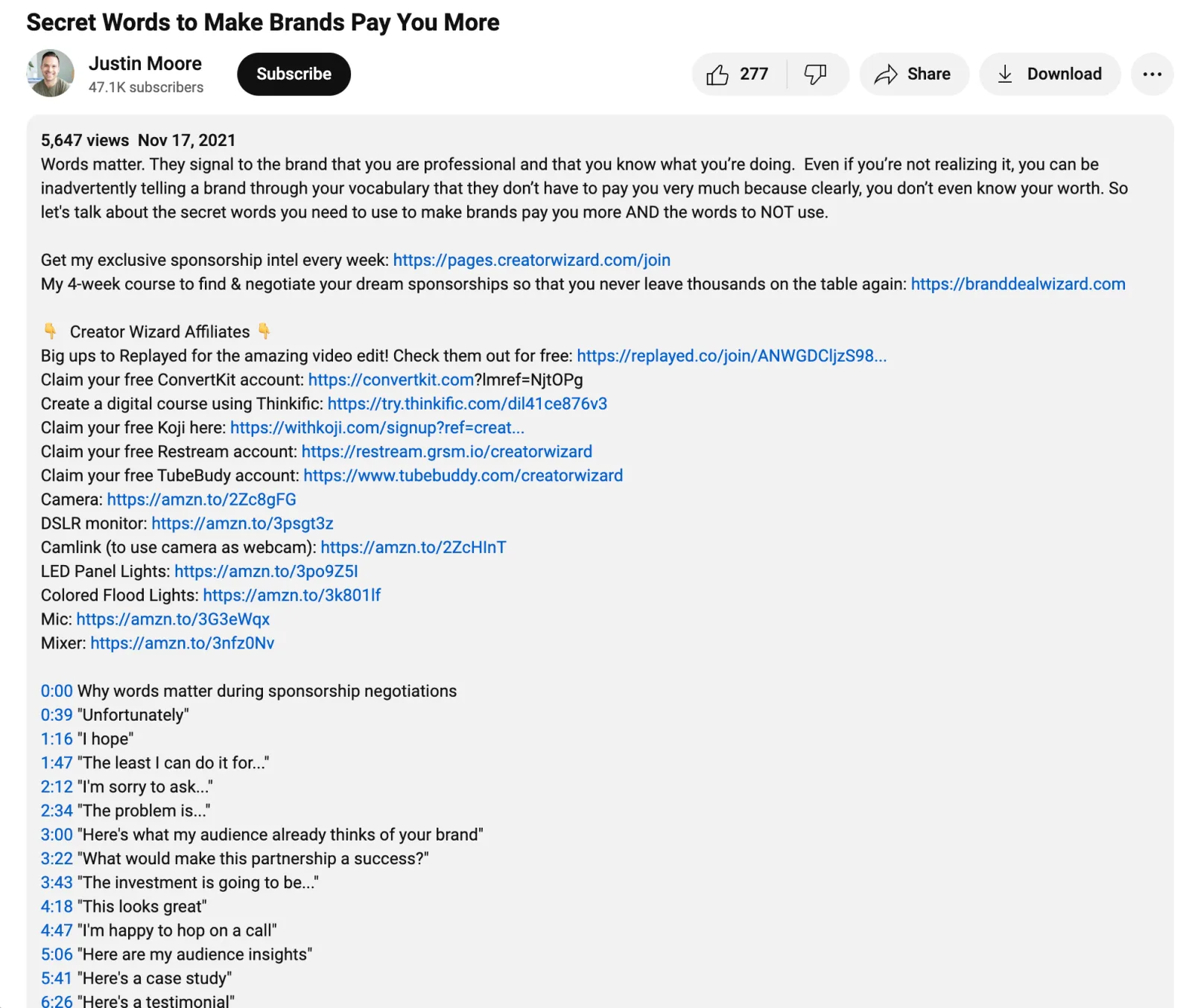 Justin Moore’s video descriptions are detailed without any clutter. Image via Creator Wizard on YouTube.