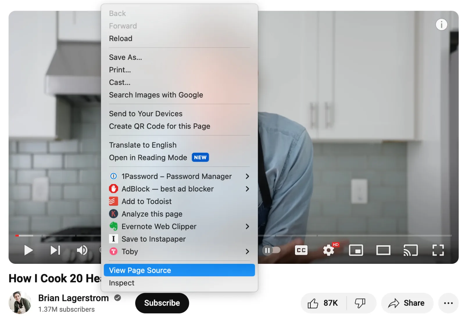 To view any video’s tags, right-click anywhere on its page and click View Page Source. When you see the source code, open the search bar (with CTRL + F or command + F) and type ‘keywords’ to locate the tags.