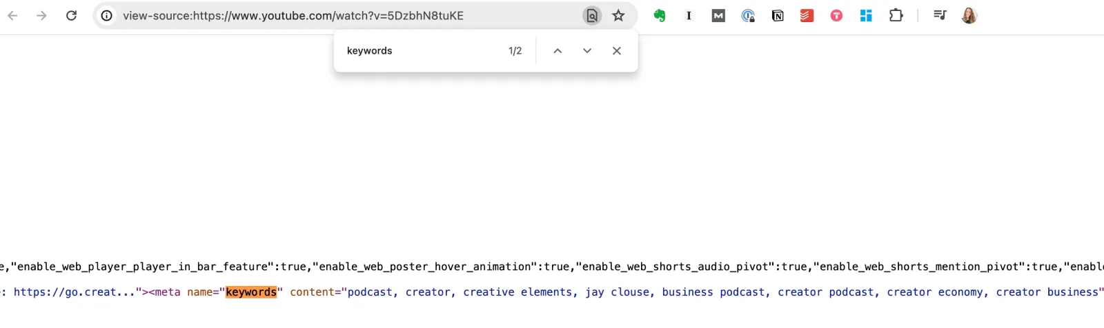 On one of his videos, looking at the page source reveals he uses video tags like podcast, creator, creative elements (which is his podcast name), Jay Clouse, business podcast, creator podcast, creator economy, and creator business—all appealing to his target audience of creators.