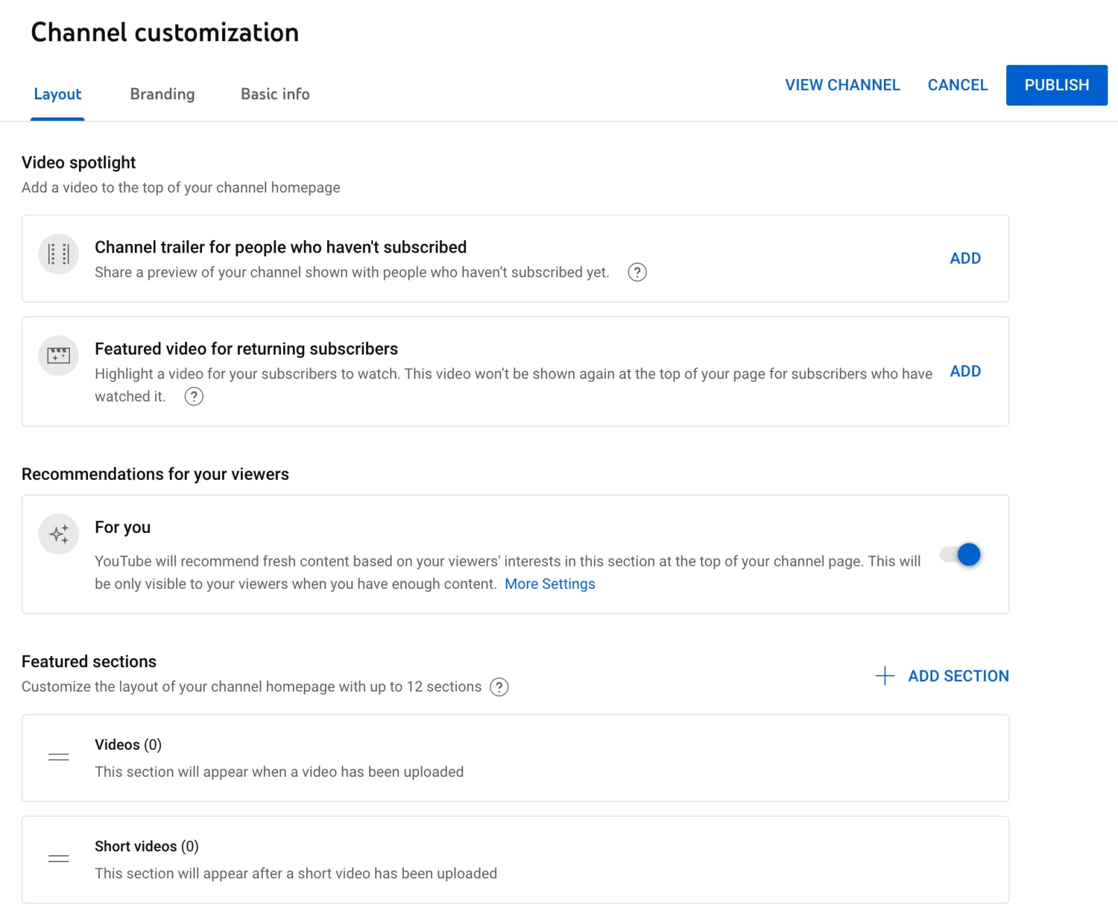 - Featured sections: the layout of your channel with up to 12 sections like Shorts, playlists, live streams, or videos on specific topics