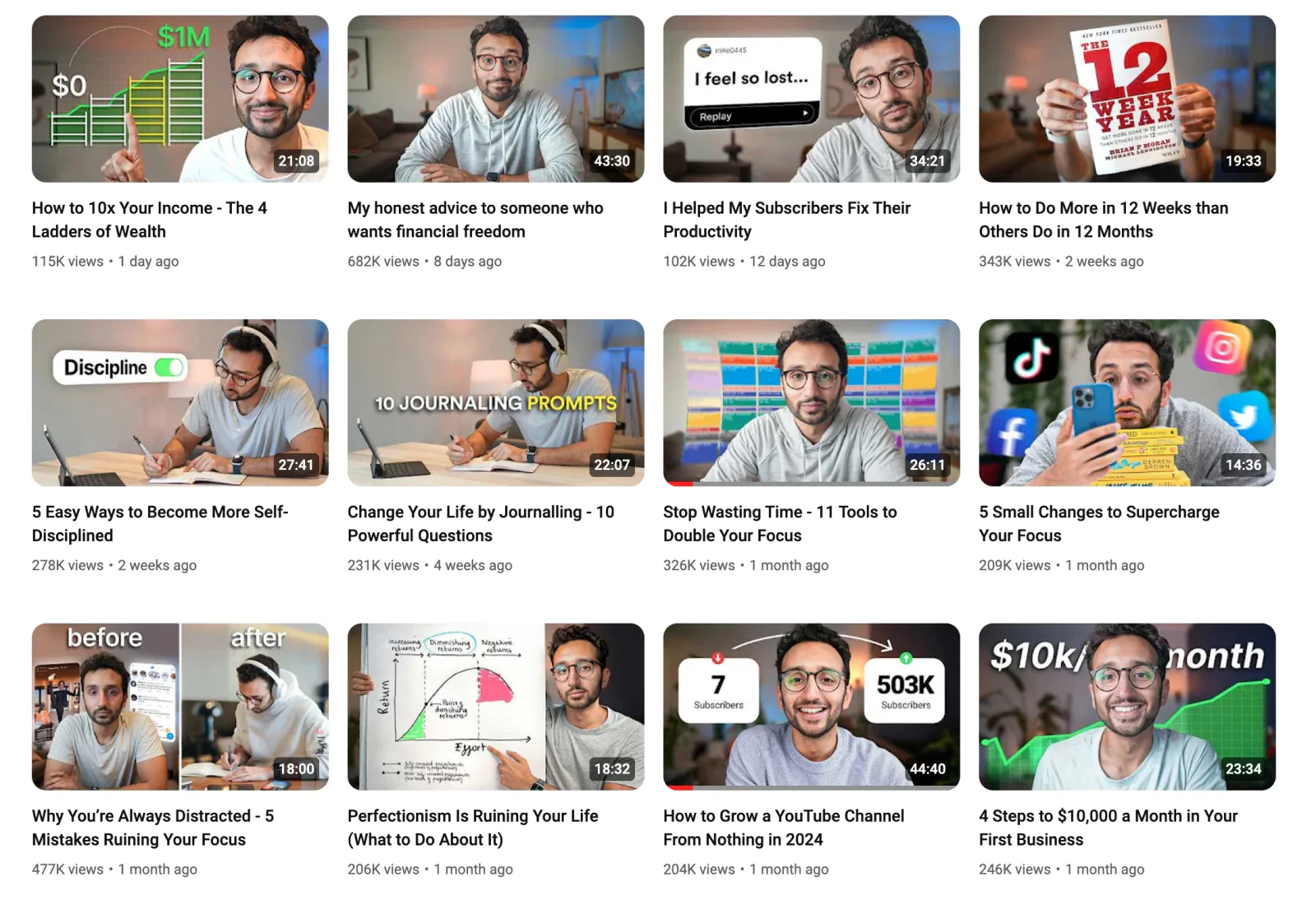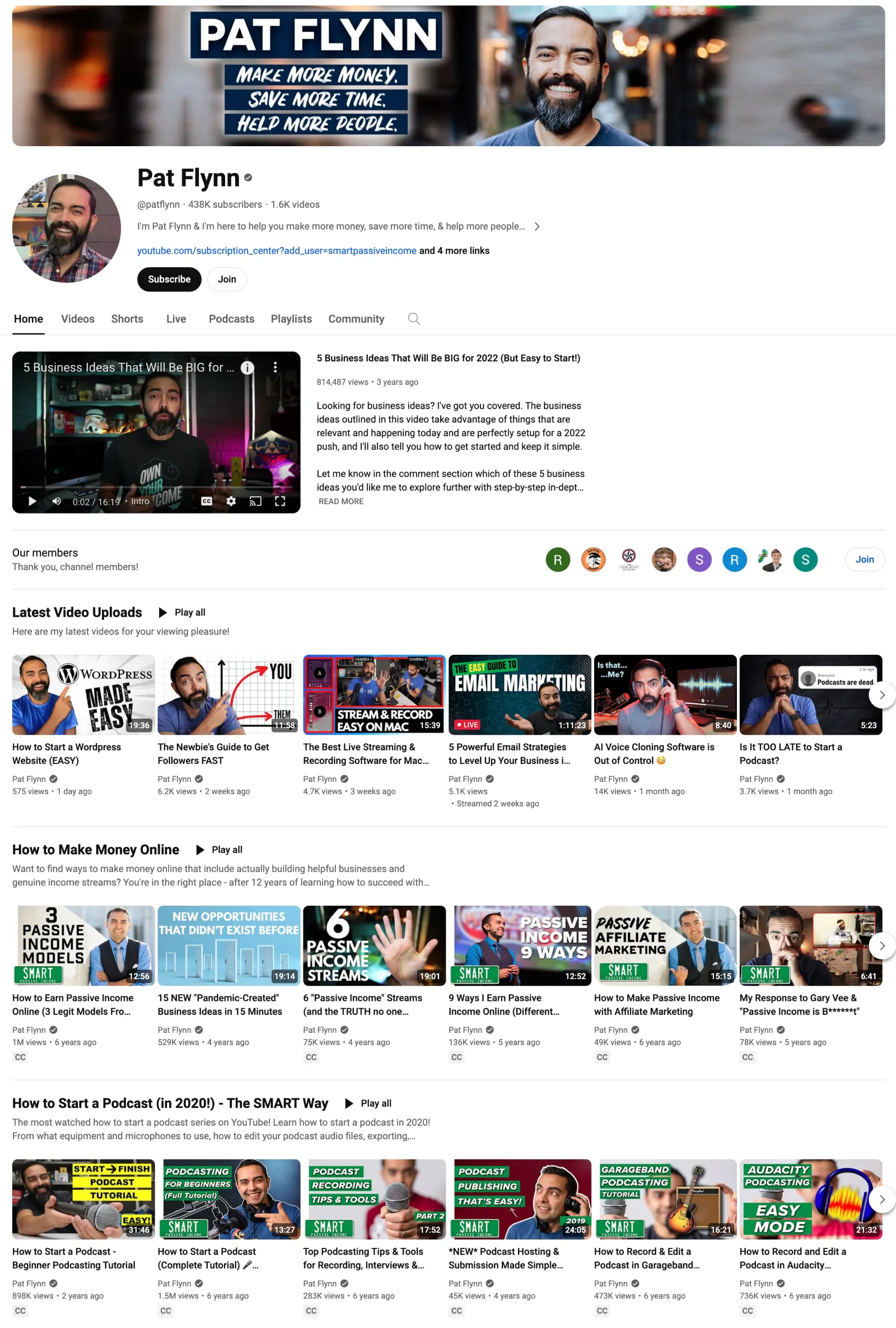 His YouTube channel is divided into categories like starting a podcast, making money online, starting a business, affiliate marketing, and more, making it easy to consume the exact content a viewer needs.