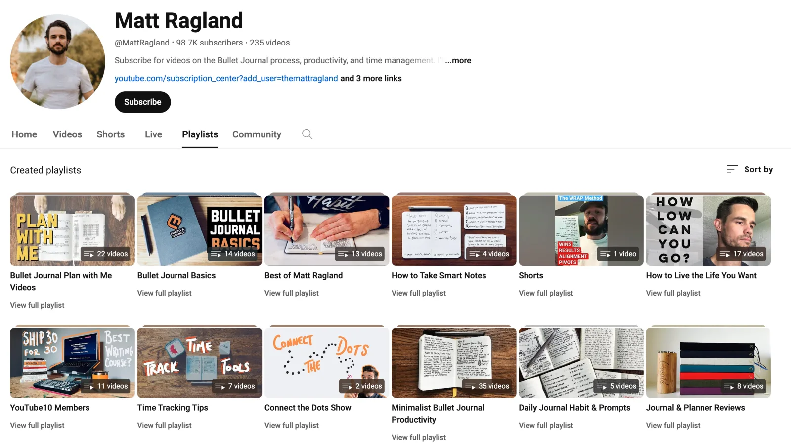 And he knows it—that’s why he built YouTube playlists on Bullet Journal planning and basics, note taking, time tracking, journaling habits, and planner reviews.