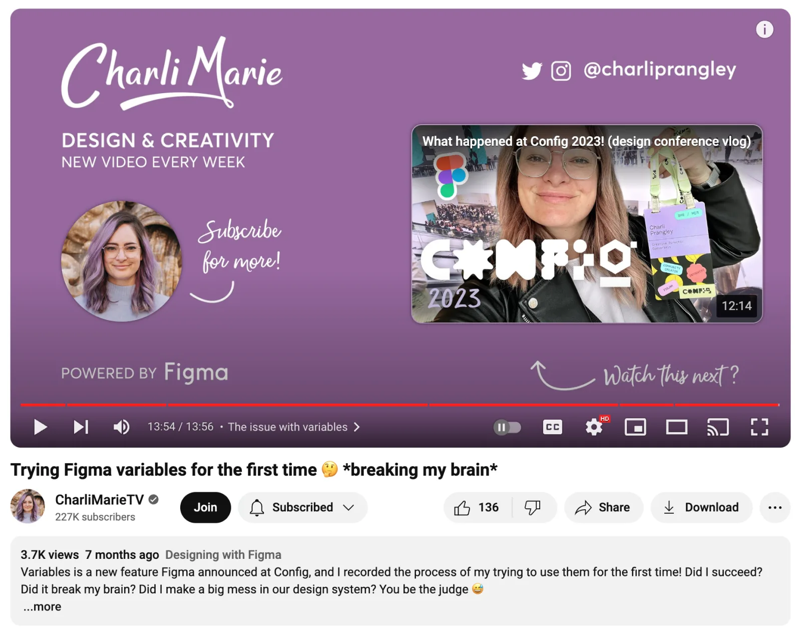 Charli Marie is a design creator and YouTuber. In her videos, she often ties the current video to a previous one by verbally inviting viewers to check it out—followed by that video’s thumbnail on the end screen.