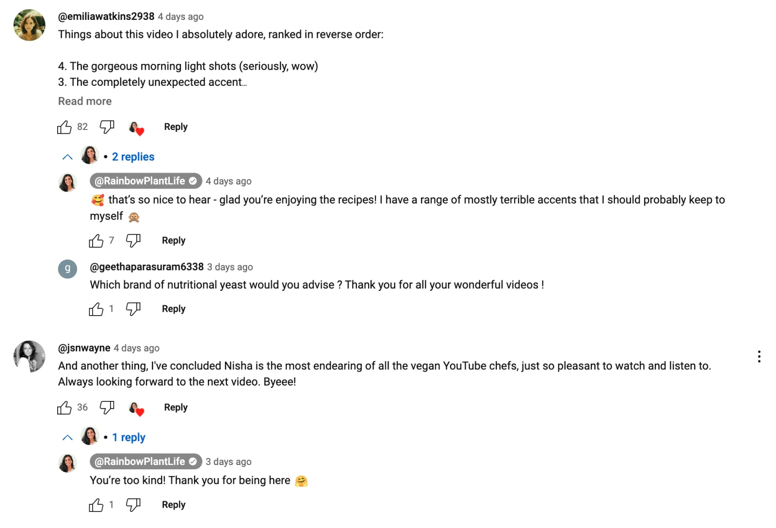 Check out how Nisha Vora of Rainbow Plant Life responds to her comments. These aren’t generic comments but genuine responses to compliments and subscriber feedback.