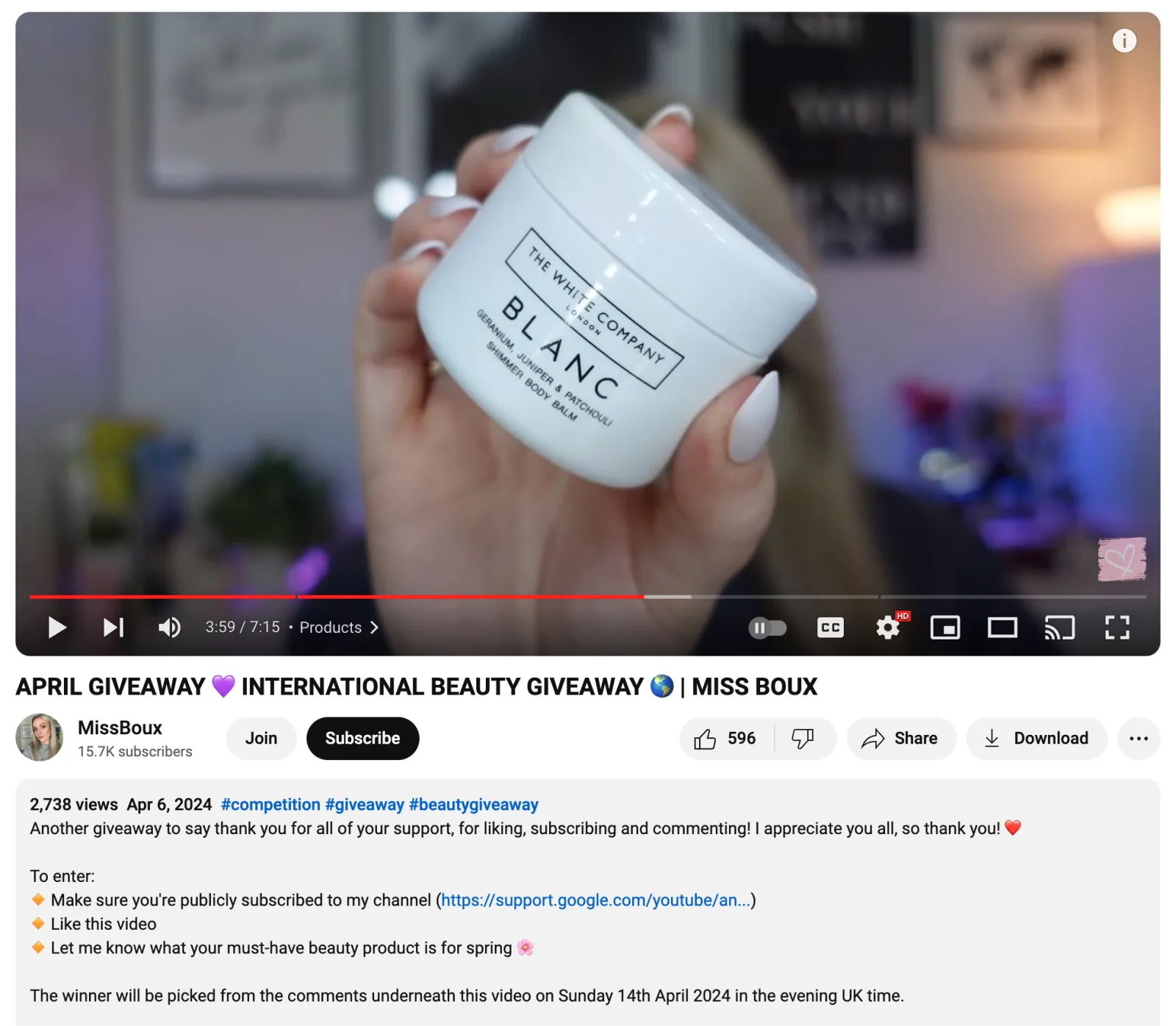 Karen Faulkner of the MissBoux YouTube channel drives subscriptions, likes, and comments with a beauty giveaway.