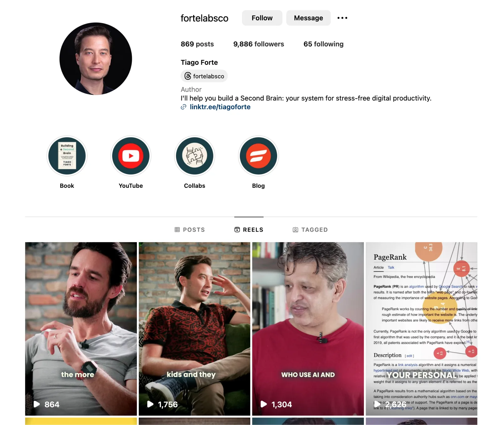 Tiago Forte promotes YouTube clips on Instagram. Image via Tiago Forte on Instagram.