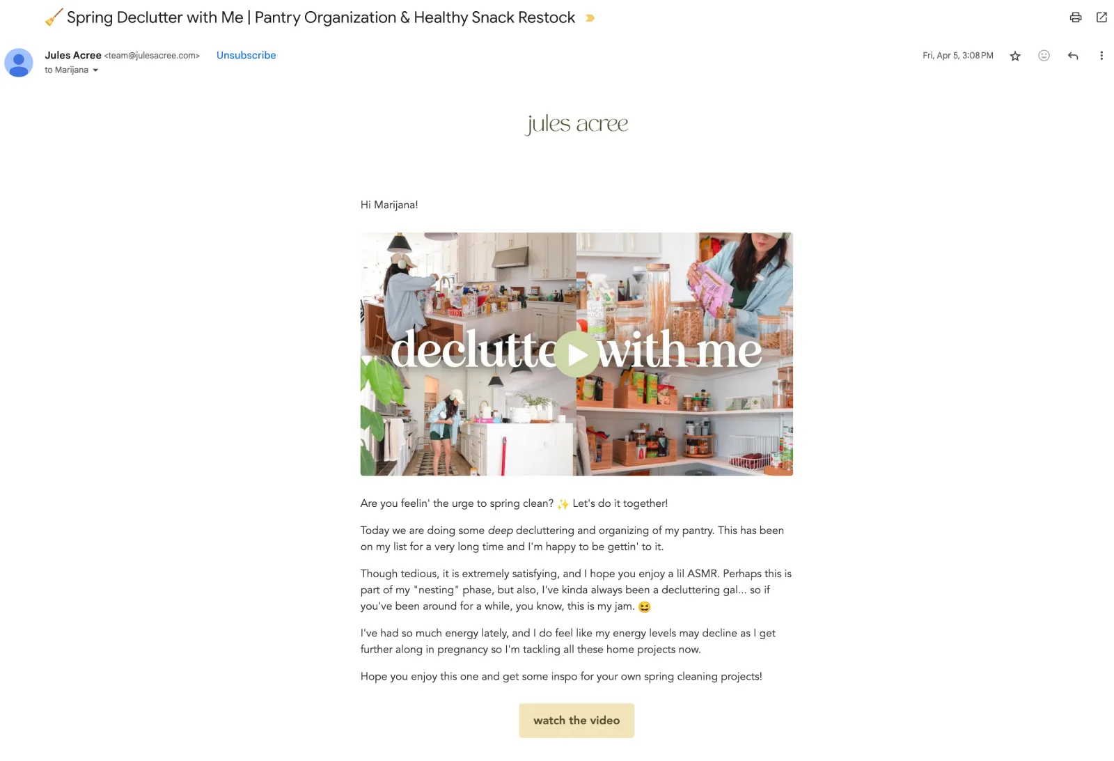Jules Acree, a self-care, productivity, and lifestyle YouTuber, sends a regular weekly newsletter. On top of that, she sends a dedicated email each time she posts a new video, along with a beautiful video thumbnail, a few paragraphs on what the video is about, and a call to action.