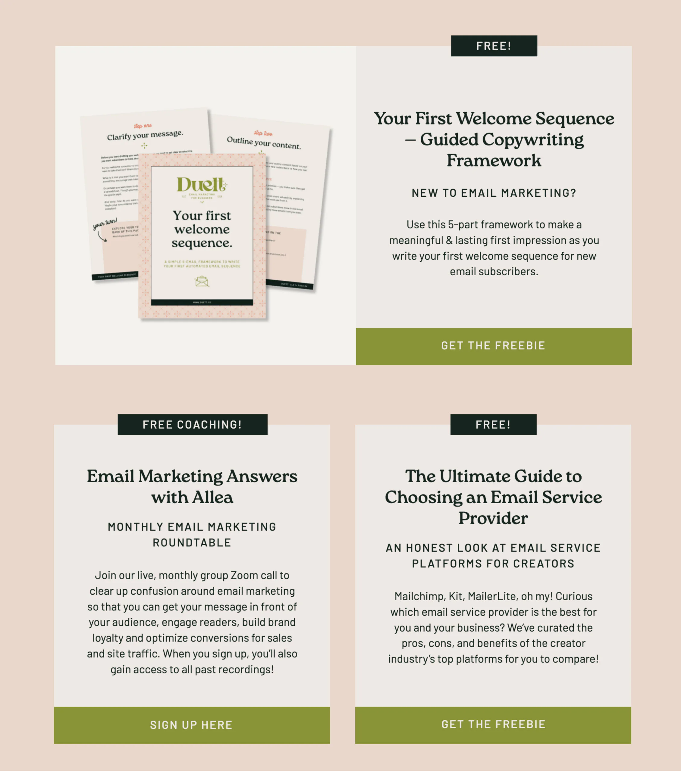 Allea Grummert of Duett offers a mix of email marketing services, including copywriting and email platform setup. So, they use a mix of incentives to attract their target audience for those services, like a framework for welcome sequence copywriting and a guide to choosing an email service provider.
