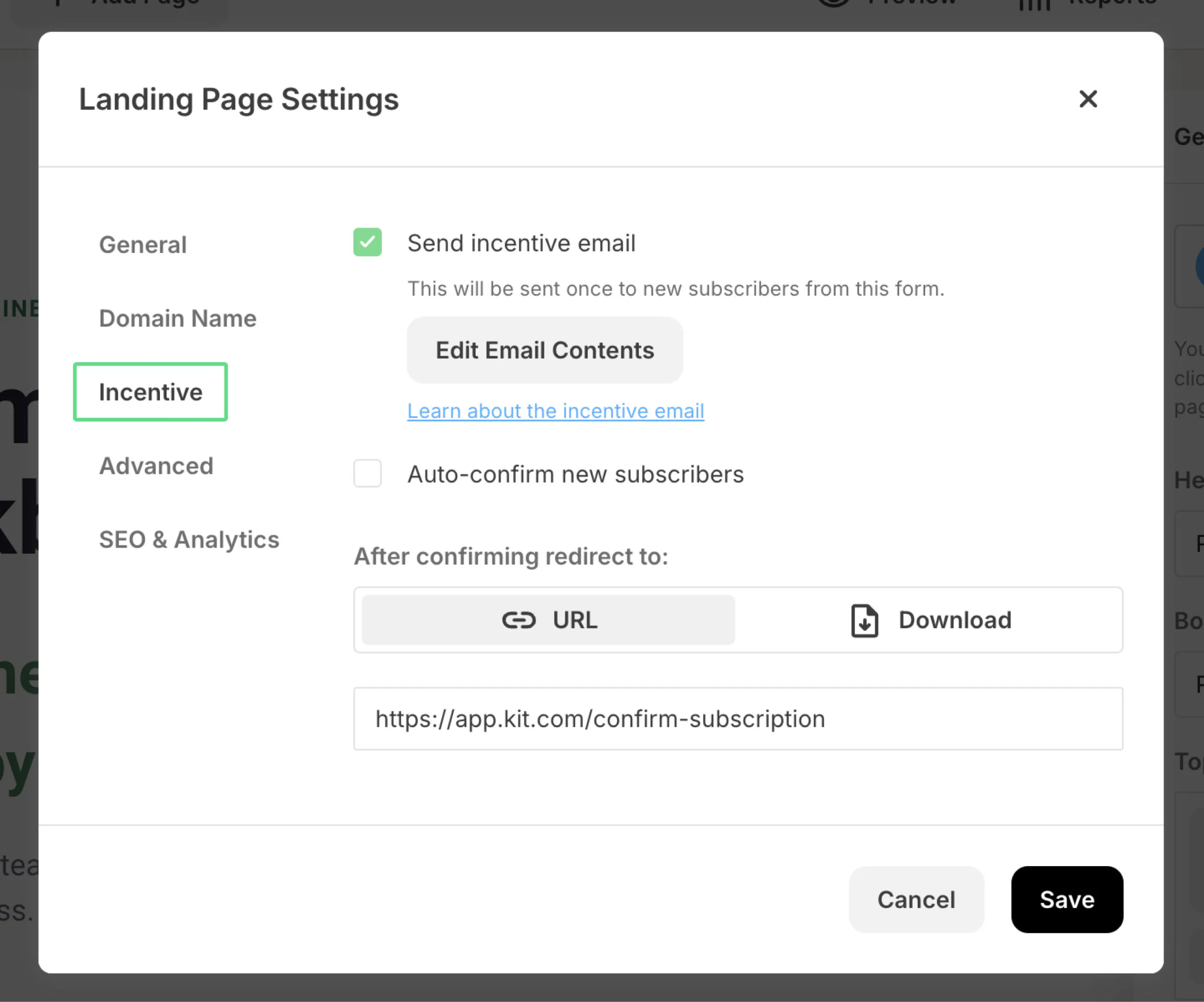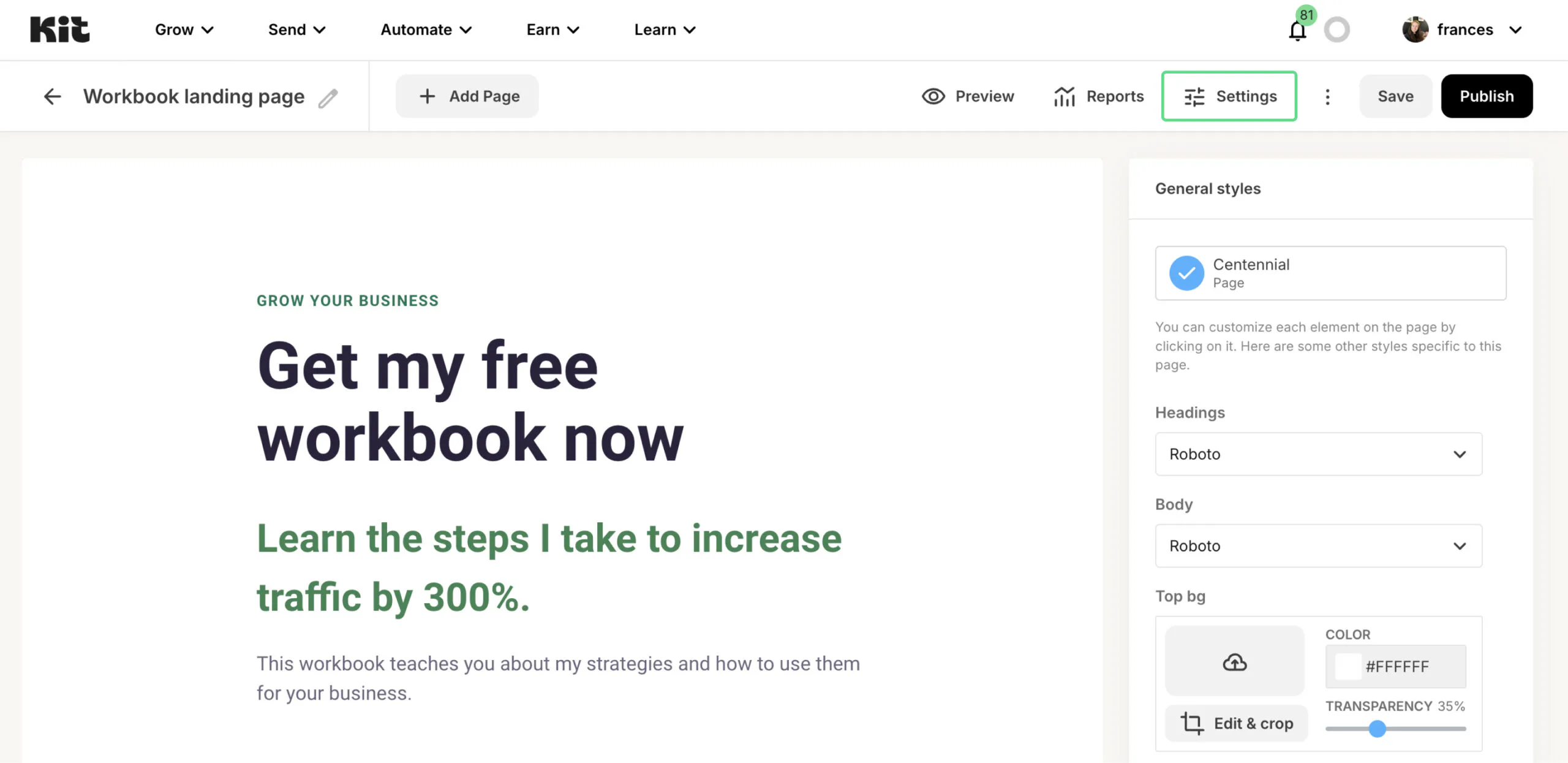 Once you design your landing page in Kit, the next step is to connect your incentive to it. That way, people get access to your lead magnet as soon as they sign up. To do this, click ‘Settings’ from the landing page designer.