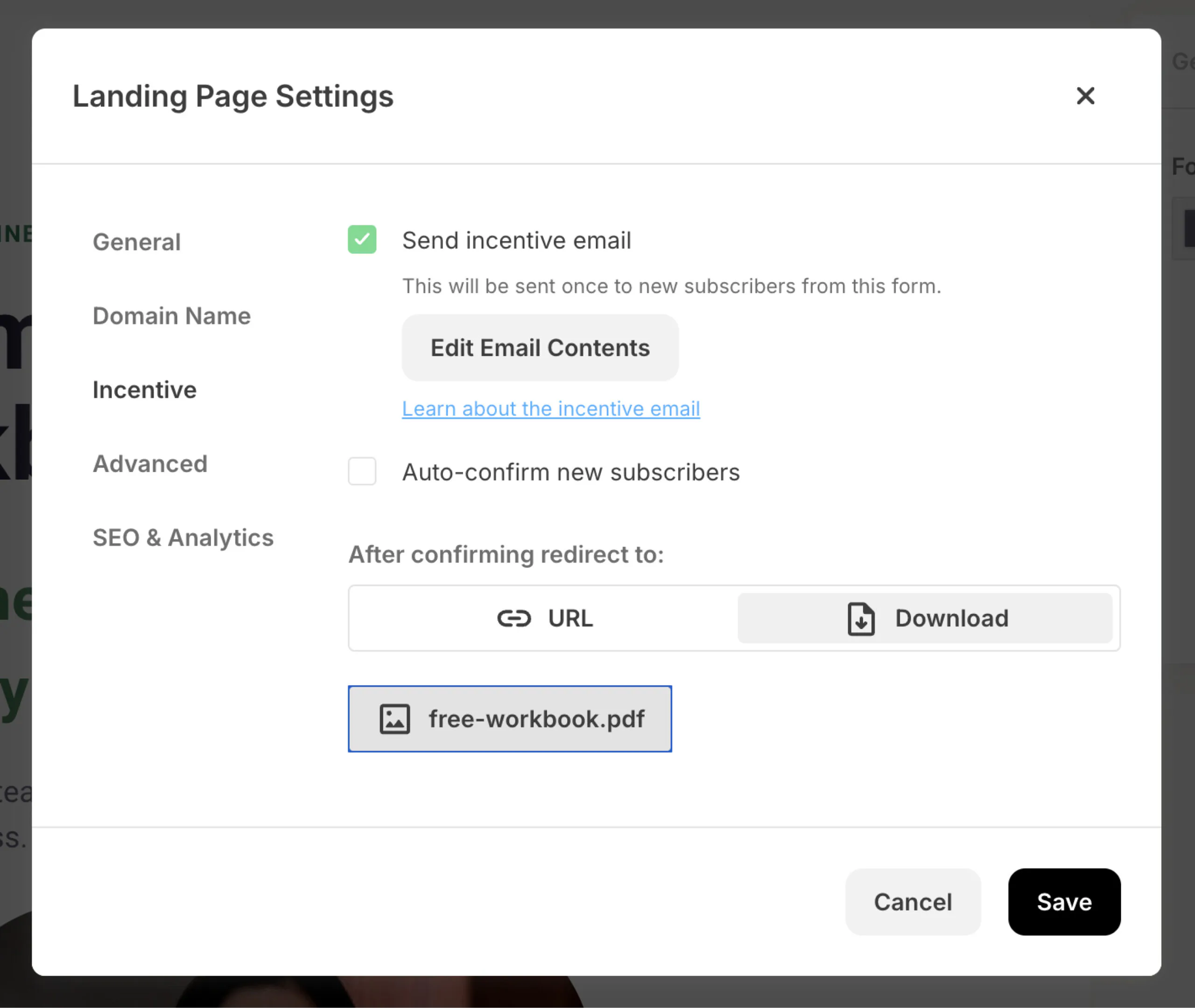 Choose whether to direct subscribers to a URL or send them a downloadable piece of content. Using a URL for your lead magnet works well when you’re giving someone access to a free community, linking to an unlisted video on YouTube, or if your lead magnet is on a page of your website. Use the ‘Download’ option if you have a PDF to send, like for an ebook or worksheet.