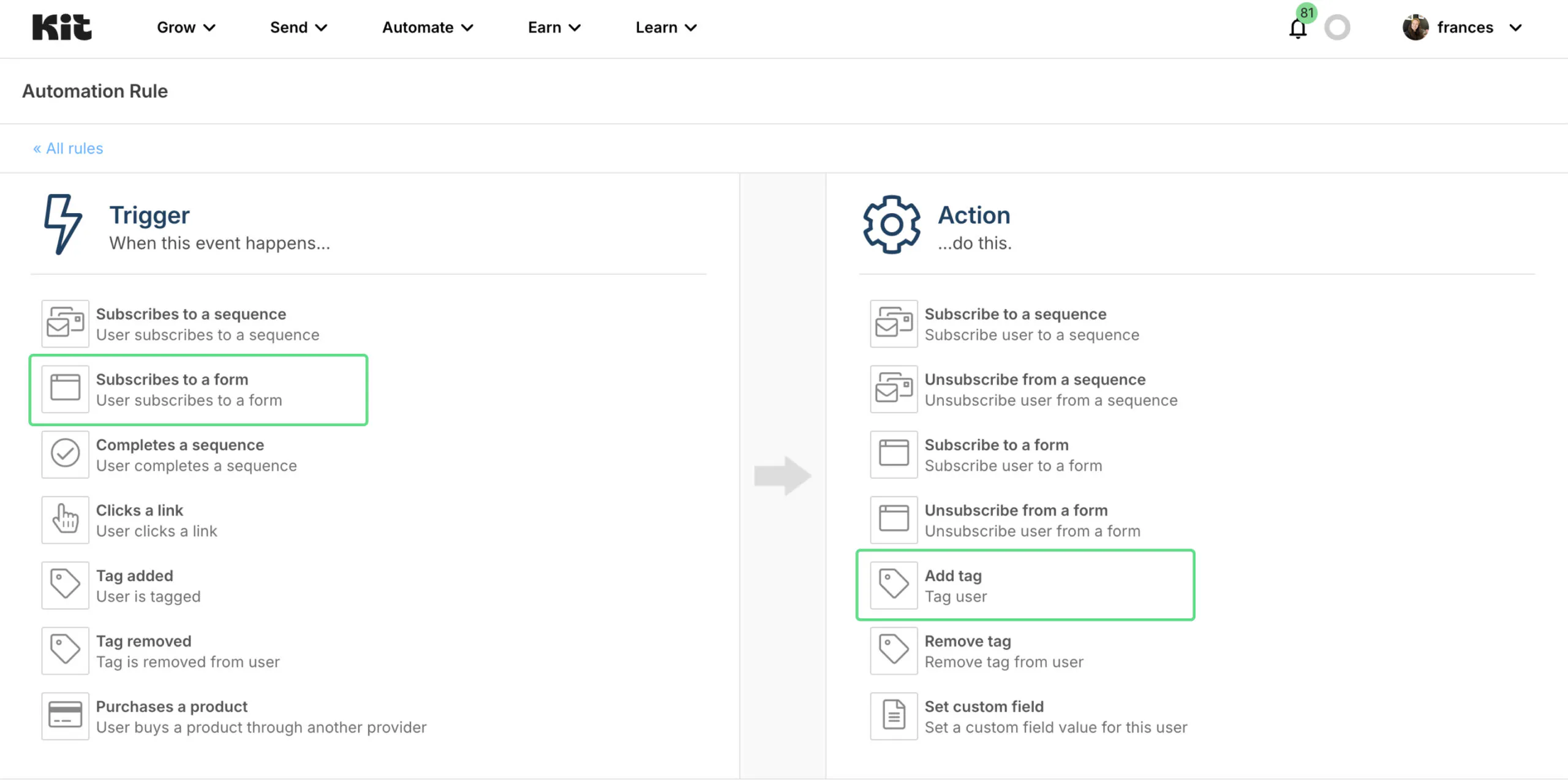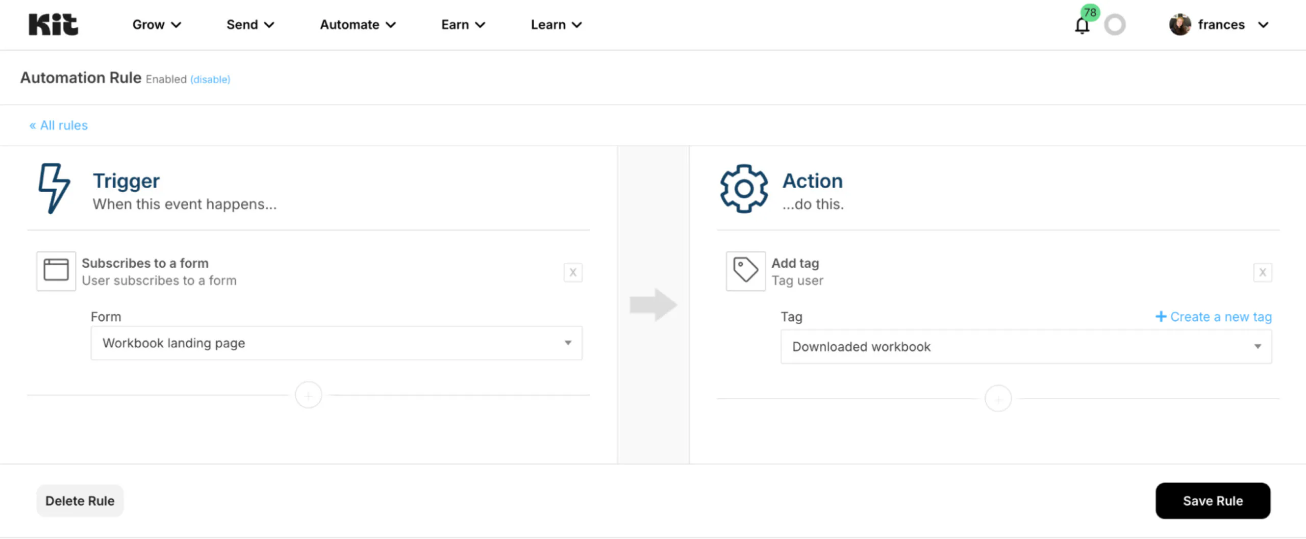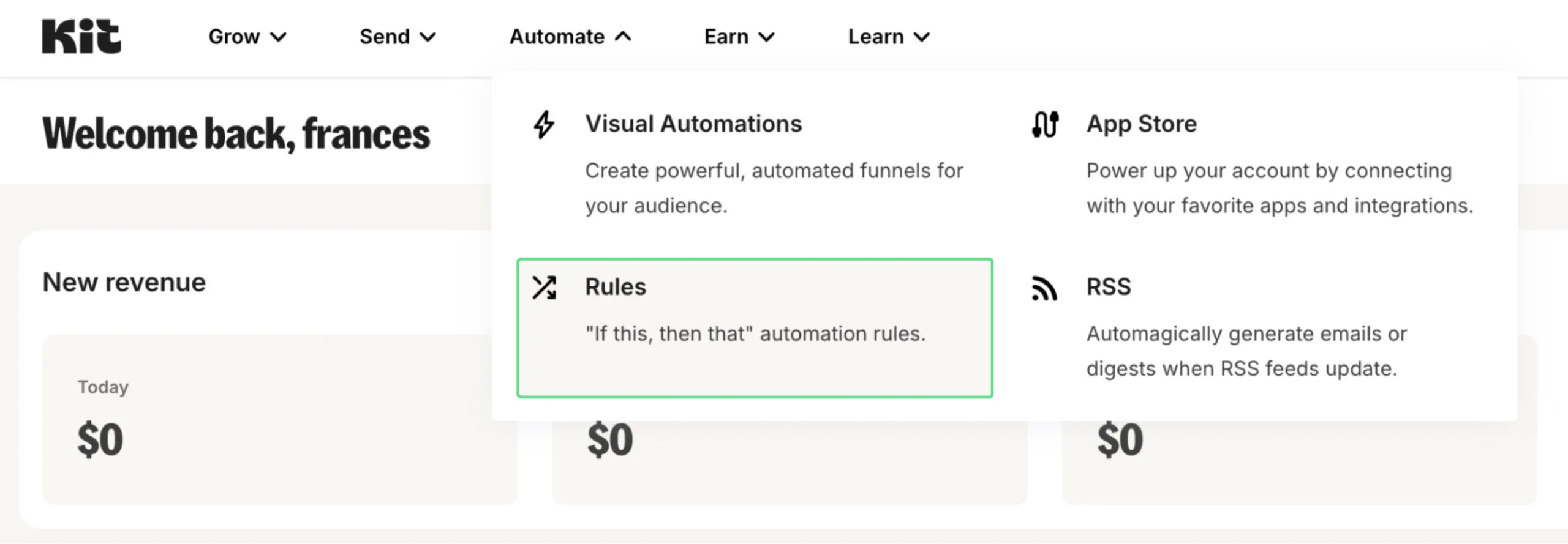 Here’s how to set up a tag in Kit. First, select ‘Rules’ under the ‘Automate’ tab from your Kit dashboard.