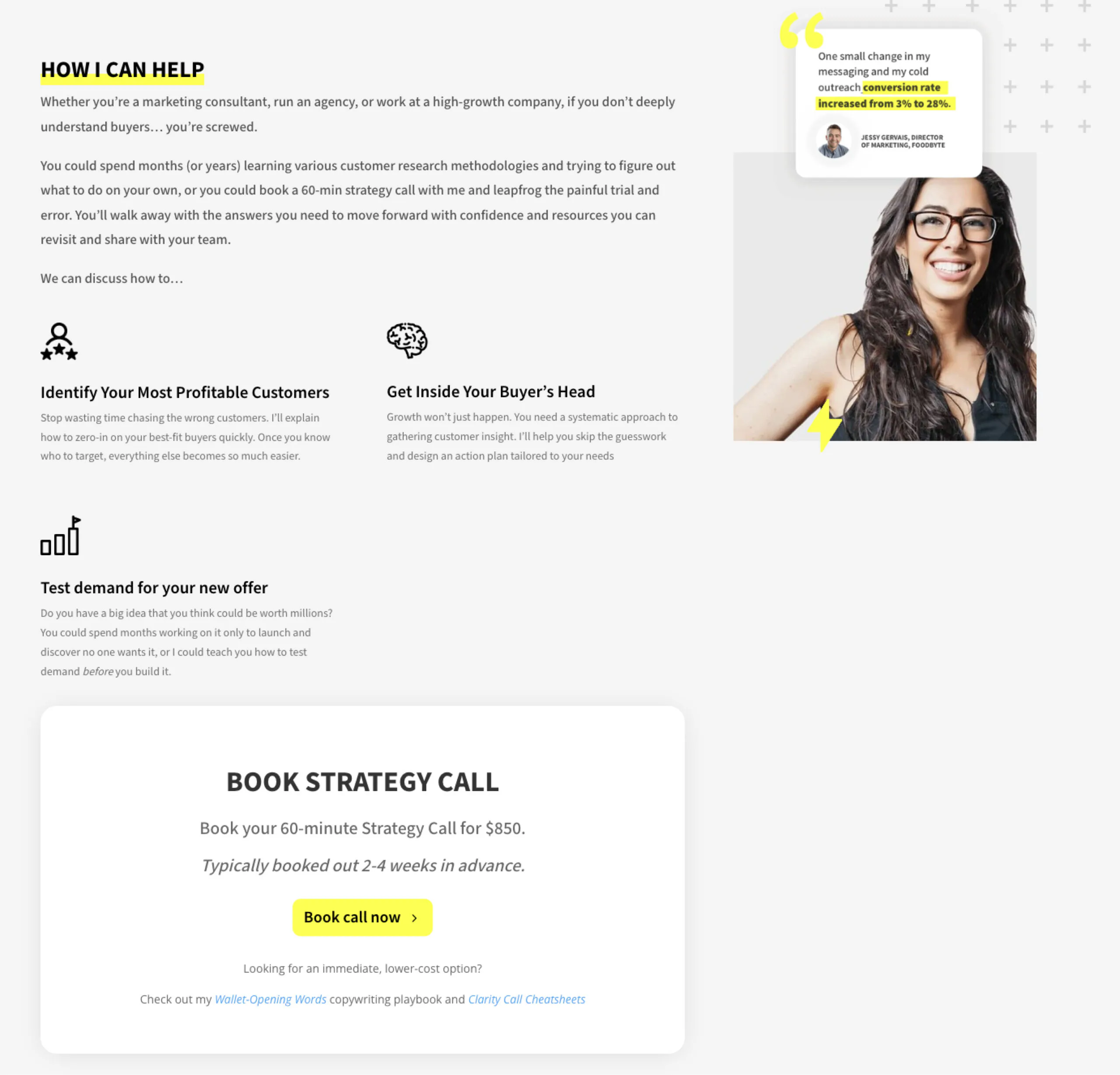 For example, Katelyn Bourgoin offers 60-minute strategy calls, and her sales page explains how customers benefit from the time. The page also has details about the cost and timeline, plus offers lower-cost options if the strategy call isn’t the right fit right now.