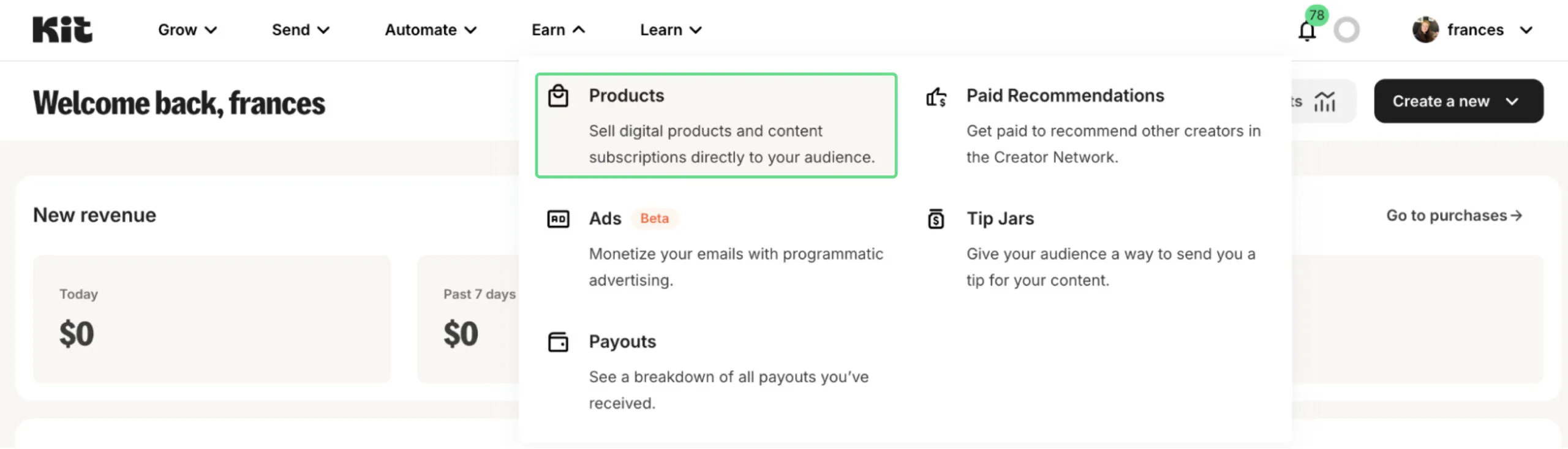 You can use Kit Commerce to sell products (like a paid set of marketing templates) or services (like your marketing audit). To set up either, click ‘Products’ under the ‘Earn’ tab of your Kit dashboard. Then, click ‘+New product.’