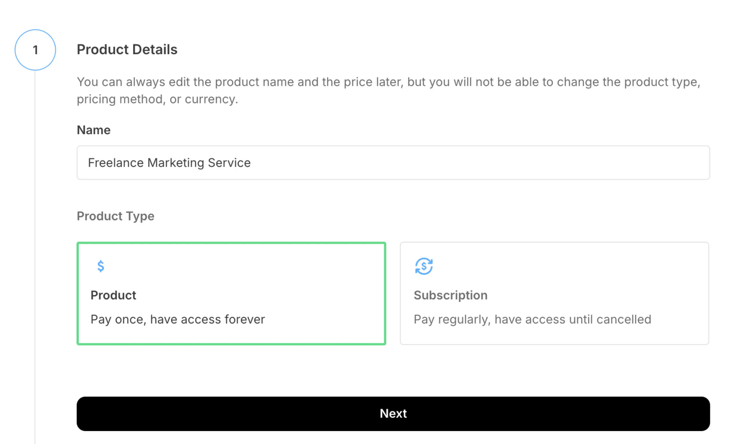 Enter the name of your product and then select the product type—either Product or Subscription. A one-off product works well for something like a 60-minute consulting call, while the Subscription option is useful for setting up monthly client retainers.