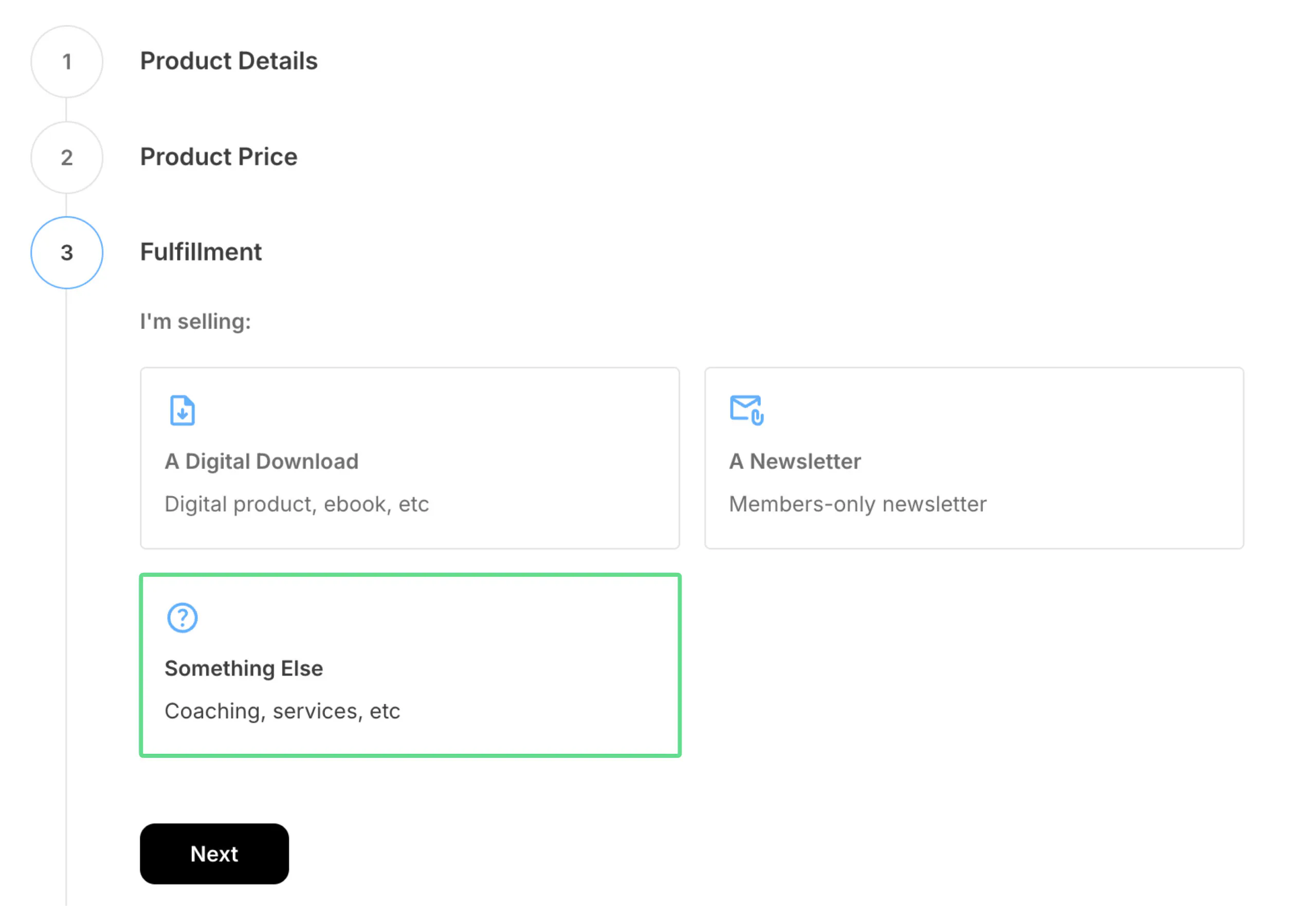 Then, you can select the fulfillment option of your Kit Commerce product. Choose ‘Something Else’ for freelance marketing services, or select ‘A Digital Download’ if you’re selling something like an in-depth ebook.