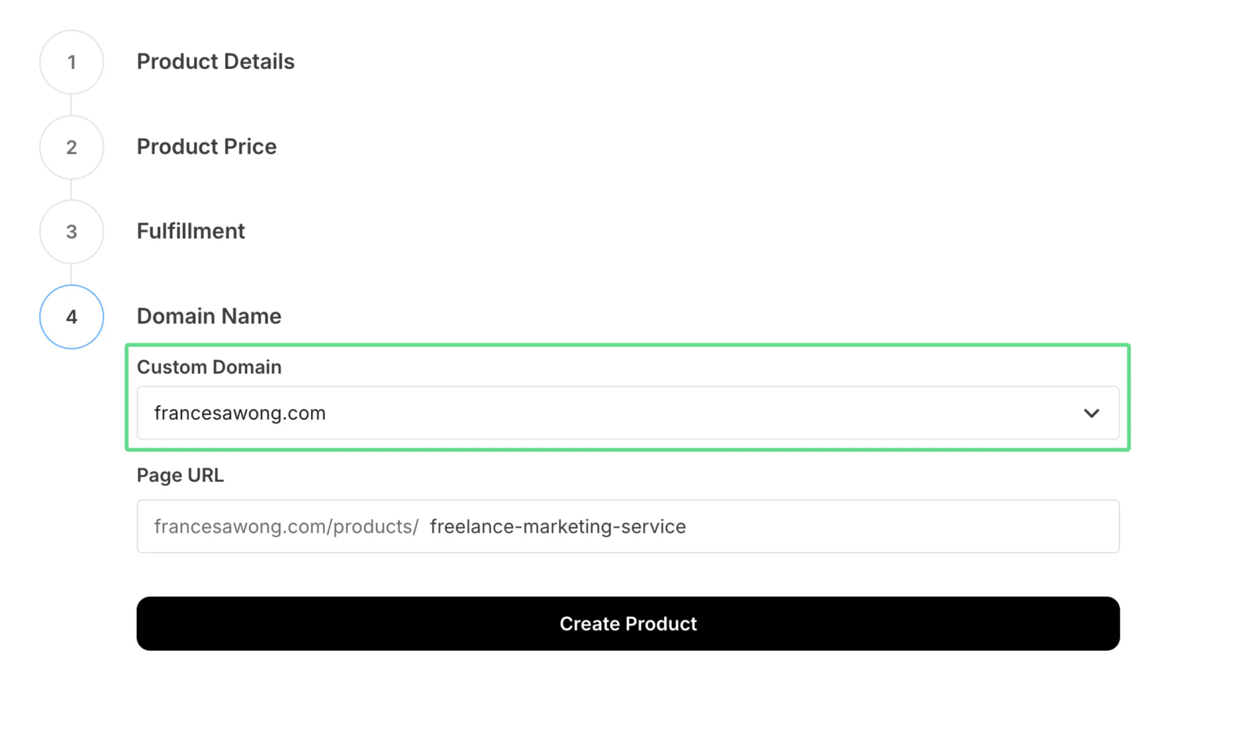 After you choose the fulfillment type, choose the domain and page URL for your Kit Commerce page and click ‘Create Product.’