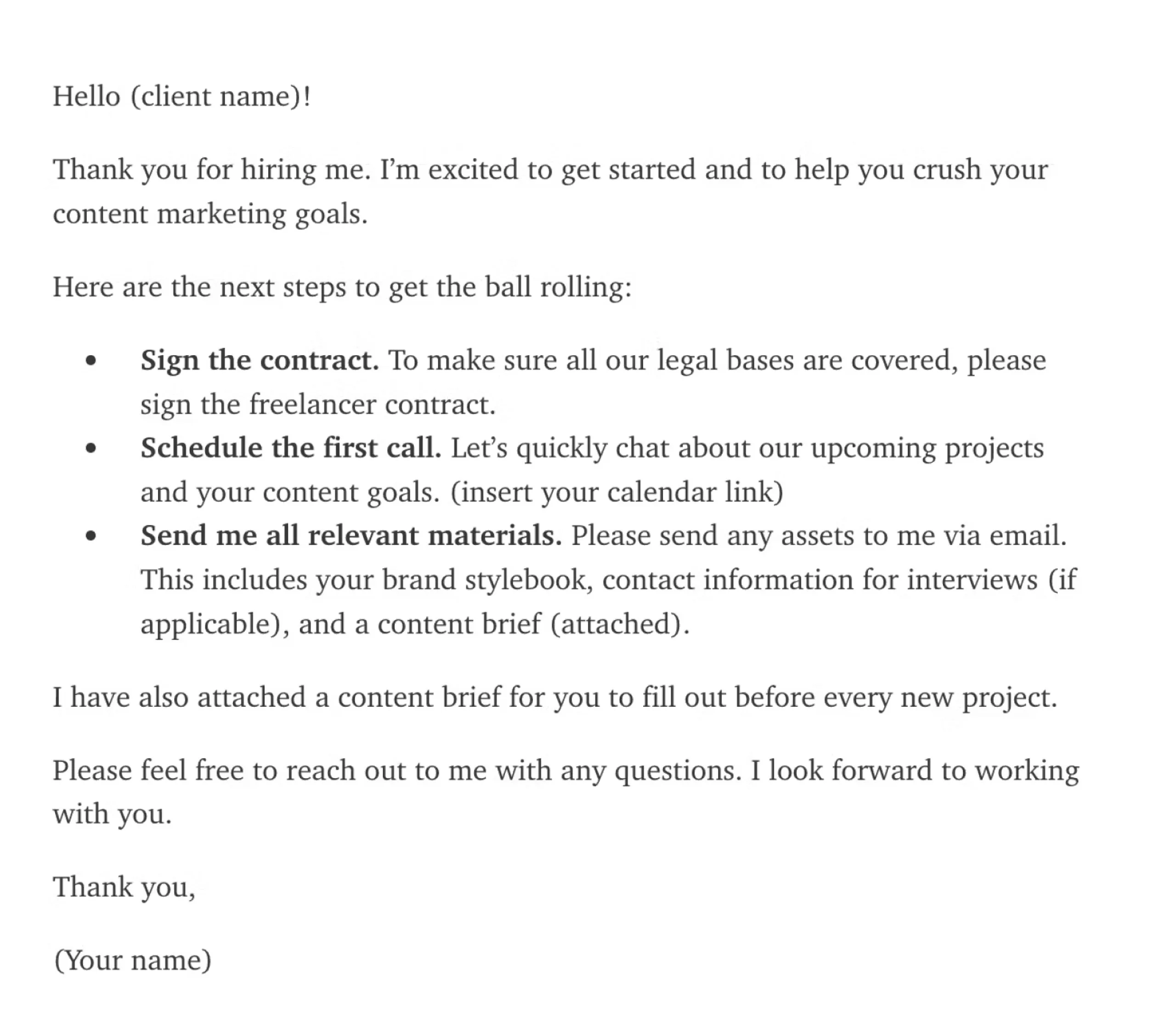 It’s also helpful to look at example onboarding emails from other freelancers, like Ashley R. Cummings’ template below.