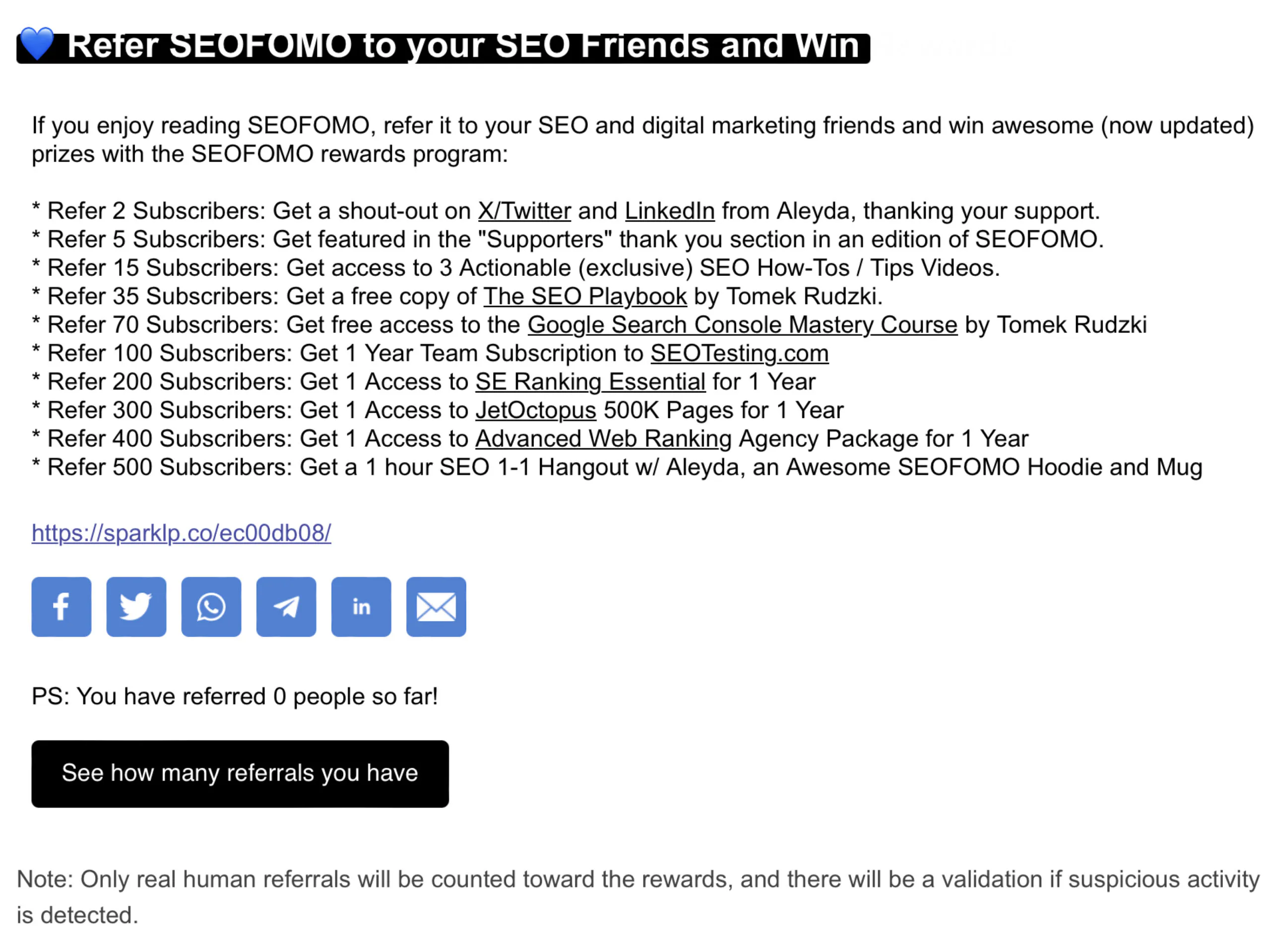 You can customize rewards for newsletter referrals. Image via Aleyda Solis.