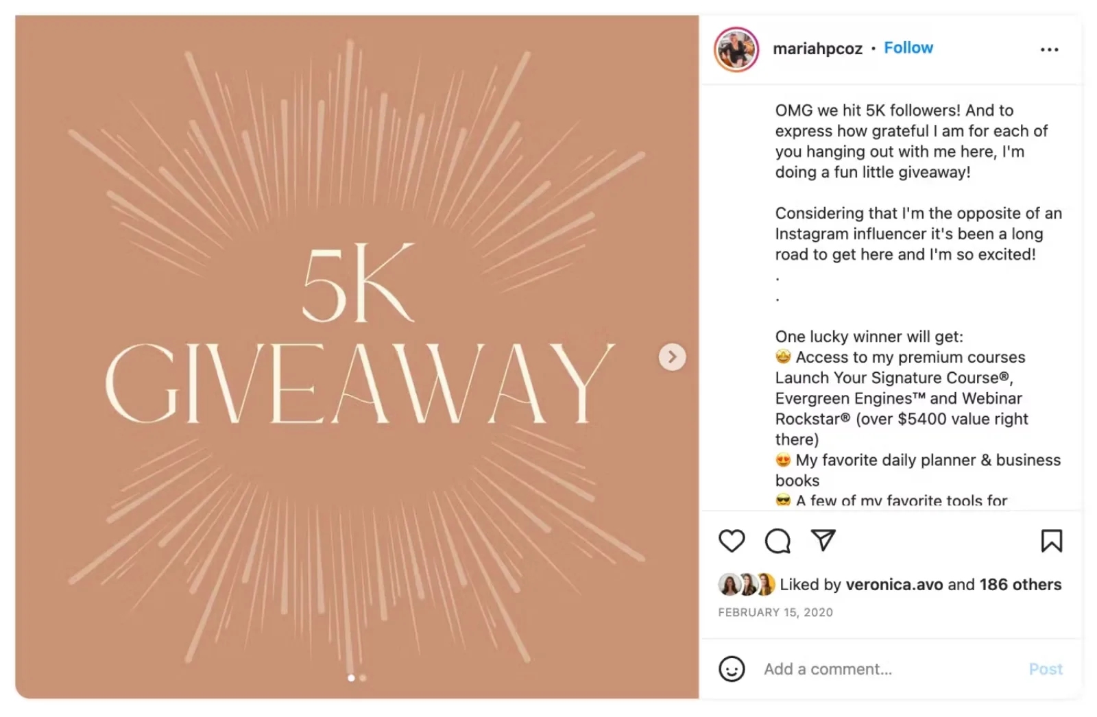 For example, when one of your rewards is free access to a paid course, people will want to know more about it. And if they need to follow you or subscribe to enter, they’ll be easy to reach when you want to promote your course again.