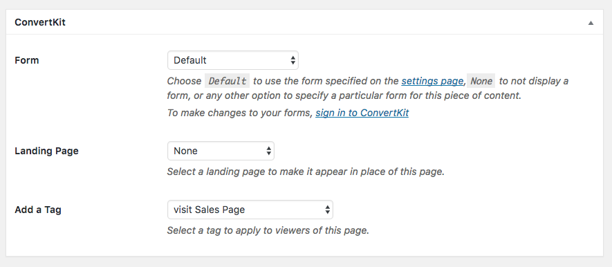If you edit a post on your blog you will find a new box added below the content editor for the ConvertKit plugin. Any form chosen here will override the category form and default setting on the plugin settings page. You can choose any ConvertKit form that will be shown just on this post. Or you can choose “None” if you don't want this post to have a form.